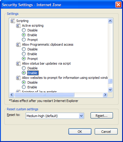 - In the listbox, scroll down to “Allow status bar updates via script”, select Enable, and then click OK on all dialog boxes.
